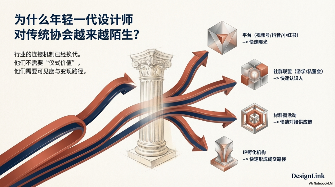 今天很多年轻设计师,对协会越来越陌生;他们更熟悉的是联盟、平台、材料商活动、本地装饰圈的饭局,甚至最近冒出来的一批IP孵化机构。