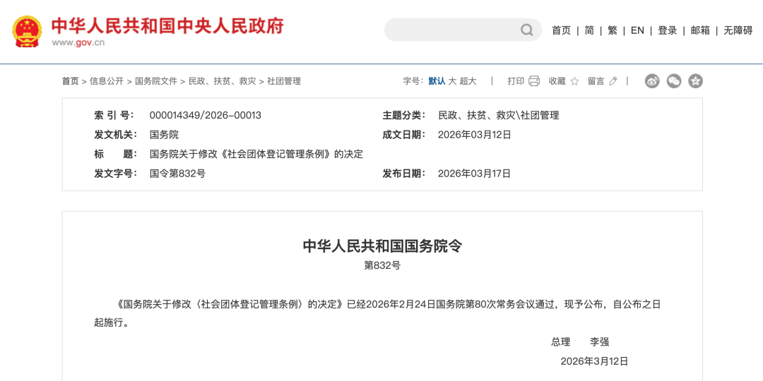 2026年2月24日,国务院第80次常务会议审议通过了《国务院关于修改〈社会团体登记管理条例〉的决定》,并于3月12日以国务院令第832号公布施行,这是《社会团体登记管理条例》自1998年颁布以来的第二次修订。距离2016年第一次为推动“放管服”改革取消社会团体分支机构、代表机构设立审批事项,恰好过去了十年。不同于第一次以“松绑放权”为核心的修订,本次修订是小范围、靶向性的制度调整,是在进一步深化行业协会商会改革发展过程中,解决行业协会商会发展中的突出问题,为行业协会商会的合并终止明确了路径。