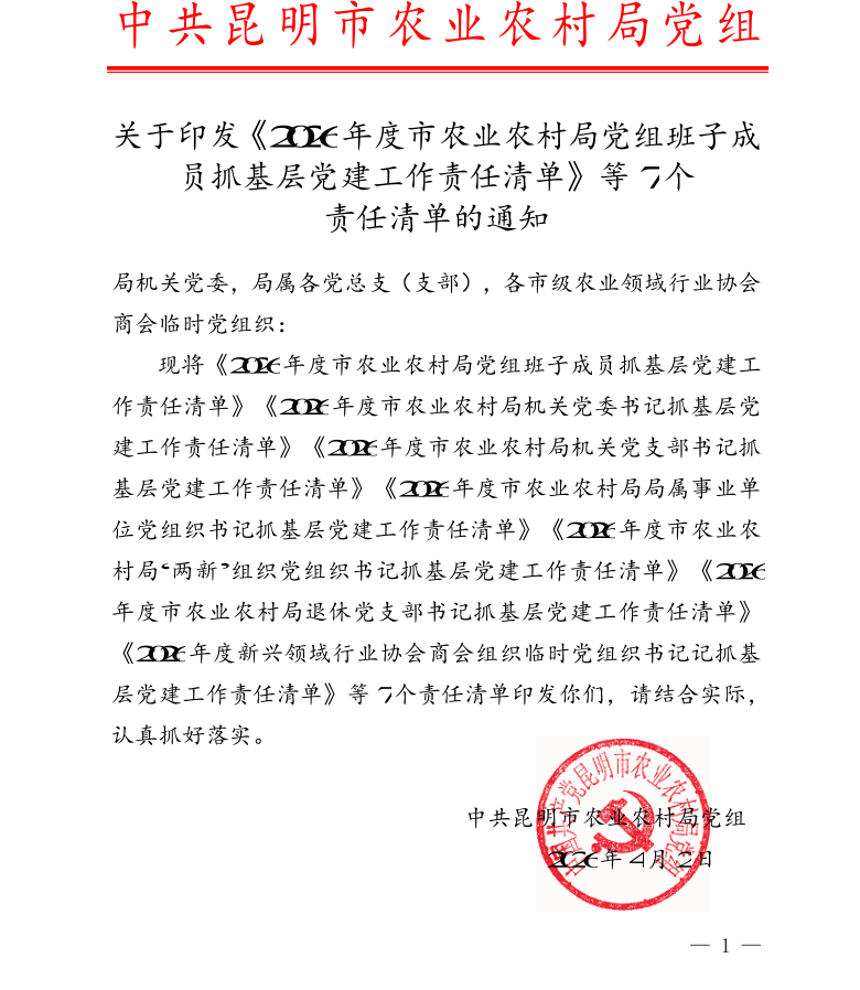 中共昆明市农业农村局党组关于印发《2026年度市农业农村局党组班子成员抓基层党建工作责任清单》等7个责任清单的通知